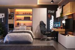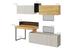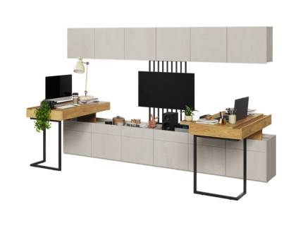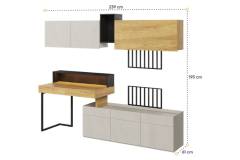 Set birou mic cu corpuri suspendate TEEN FLEX 02 239x193x61cm cu suport pentru suspendat TV, comoda, sistem de iluminare LED