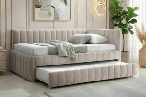Pat tapitat cu somiera si pat suplimentar ALFIE RAVEN (120x200cm) material textil beige