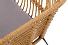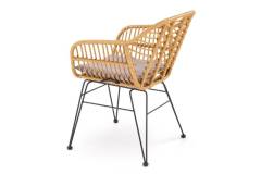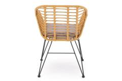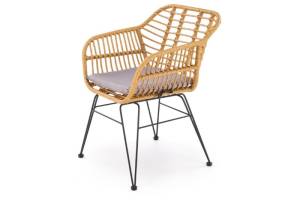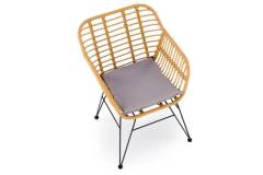 Scaun de grădină K541, realizat din rattan sintetic în nuanță frasin, cu picioare din metal vopsit în nuanță neagră. Perna de șezut, în nuanță gri, adaugă confort și eleganță. Perfect pentru grădină, terasă sau balcon, acest scaun combină durabilitatea materialelor cu un design modern și stilat, ideal pentru momente de relaxare în aer liber.
