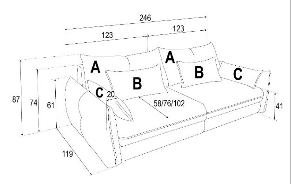 Adancimea sezutului: 58 / 76 / 102 cm
