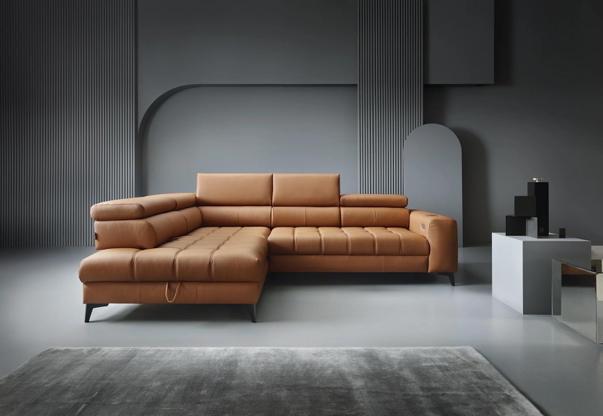 Coltar cu reglaj electric BAGGIO cu lada pentru depozitare, tetiere reglabile, incarcator wireless pentru telefon, personalizabil 280x196cm