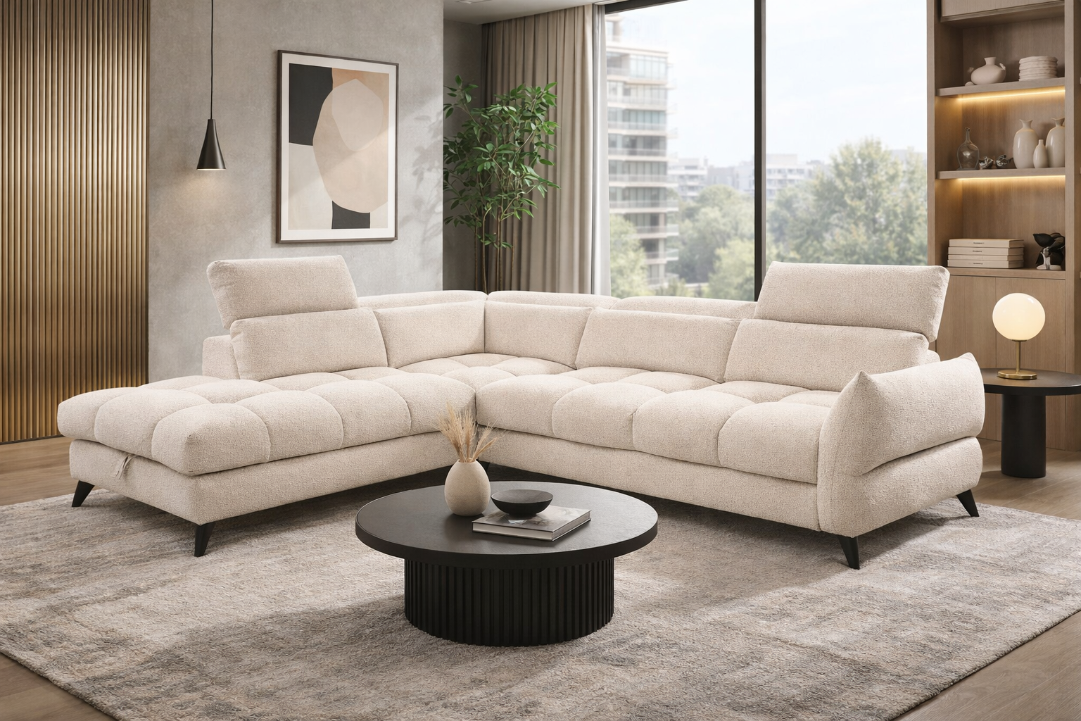 Coltar extensibil FUBU cu lada pentru depozitare, tetiere reglabile, personalizabil 263x234cm
