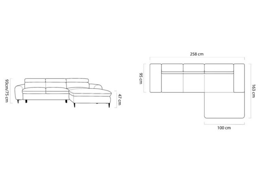 Coltar extensibil RAYO S cu lada pentru depozitare, tetiere reglabile, personalizabil 258x163cm
