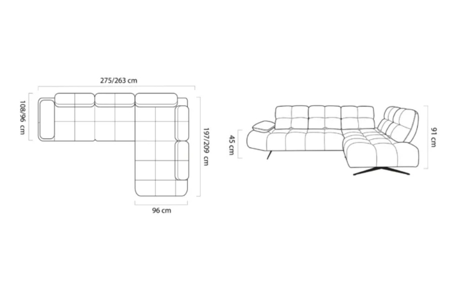 Coltar fix PRADO L cu spatar reglabil, cotiera reglabila, personalizabil 263-275x197-209cm