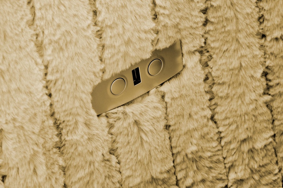 Fotoliu PEGAS rotativ cu recliner electric, incarcare USB integrata, functie de balansoar, material plusat curry, confortabil 110x110-170xH81-108cm