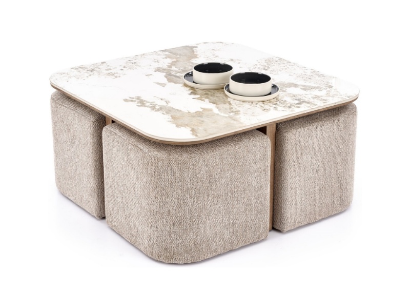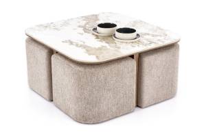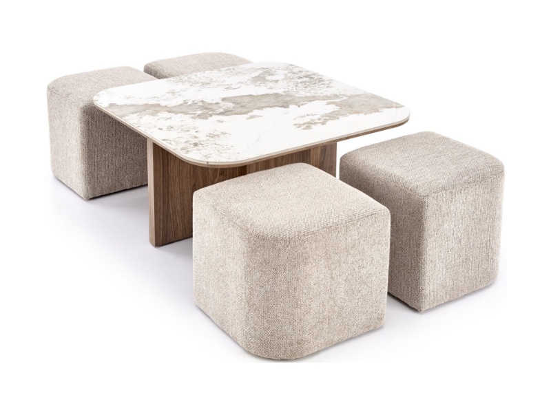Masuta ARAKIS din MDF sinterizat cu efect de marmura bej/ furniruit nuc deschis, cu 4 tabureti tapitati beige 90x90xH45cm