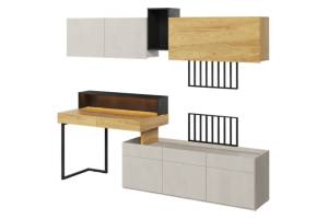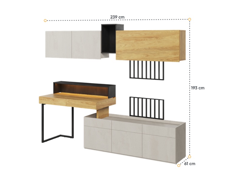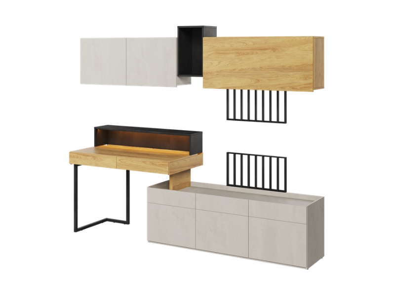 Set birou mic cu corpuri suspendate TEEN FLEX 02 239x193x61cm cu suport pentru suspendat TV, comoda, sistem de iluminare LED