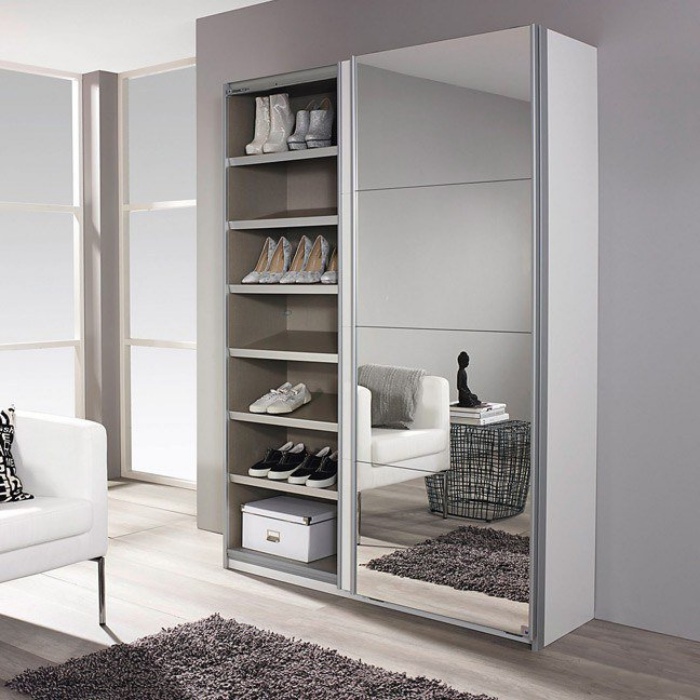 Optează pentru un singur dulap care să înglobeze tot ce ai nevoie: o bară pentru umerașe, polițe pentru pantofi și oglinzi pe uși.