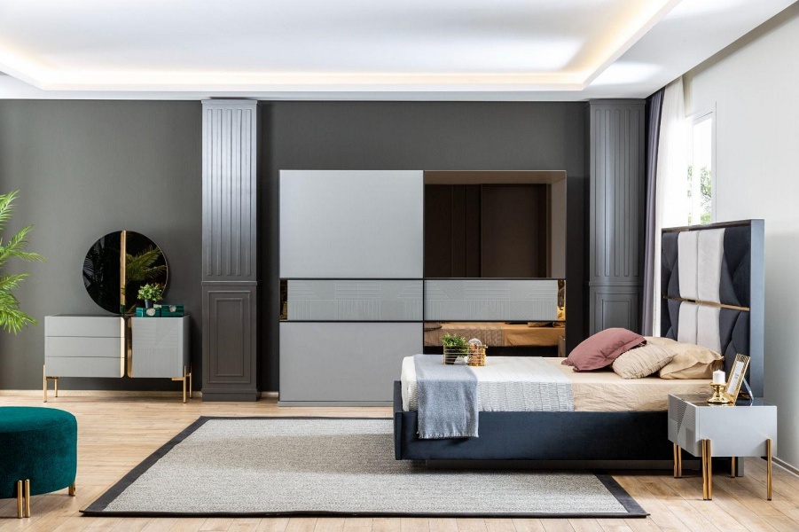 Cum se folosește: Pereți gri, mobilier gri și accente aurii la picioare de mobilier, mânere sau decor.