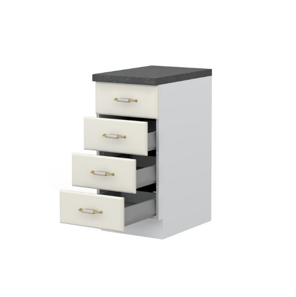 - Partea frontală a elementului este realizată dintr-un MDF complet lacuit UV, cu un efect mat moale de culoare fildeș