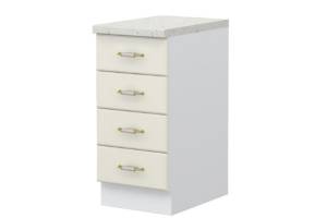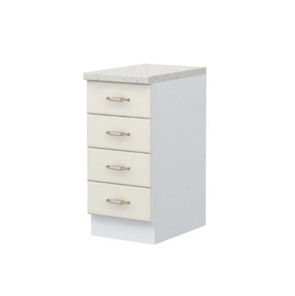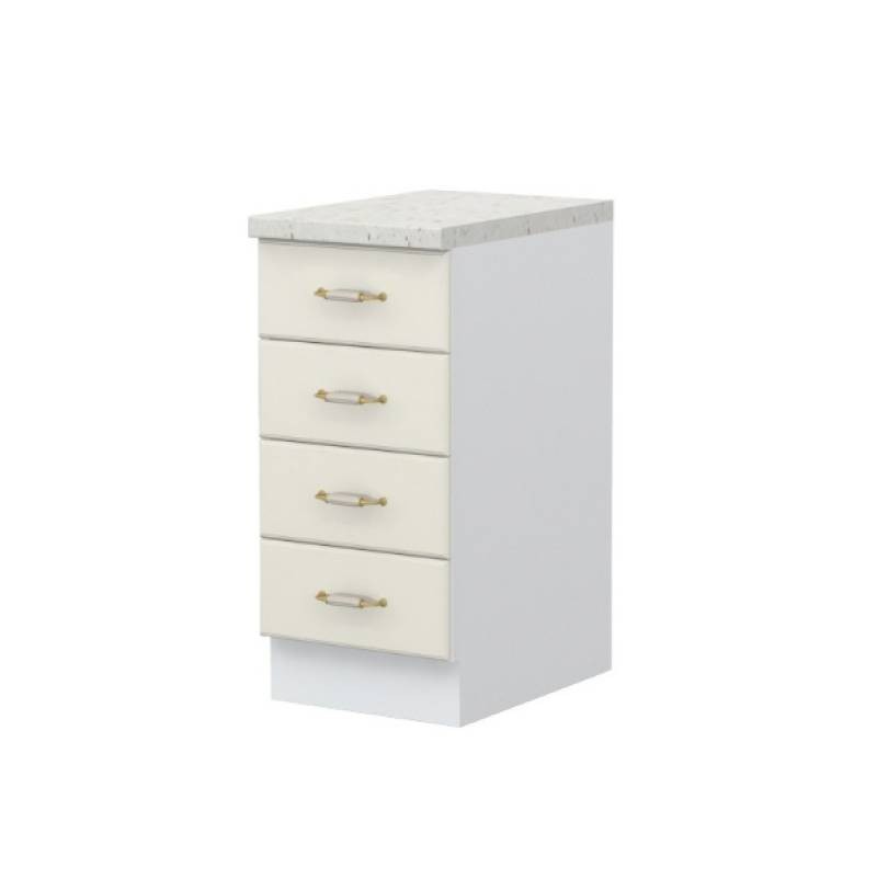 - Partea frontală a elementului este realizată dintr-un MDF complet lacuit UV, cu un efect mat moale de culoare fildeș