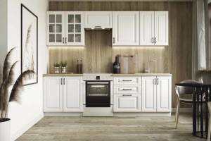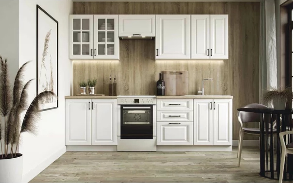 Colecția Evergreen, design clasic cu fronturi din MDF frezate în nuanța Ivory, lăcuite cu lac UV pentru un aspect elegant și rezistent. Dotată cu sistem de închidere soft-close, combină funcționalitatea modernă cu estetica tradițională. Ideală pentru un spațiu sofisticat.