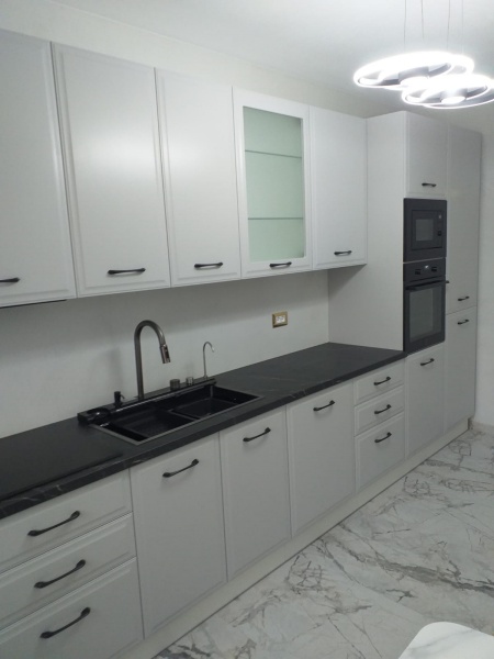 - Fronturile elementului sunt realizate din MDF sculptat complet lacuit cu lac UV de culoare gri deschis cu un efect mat moale.