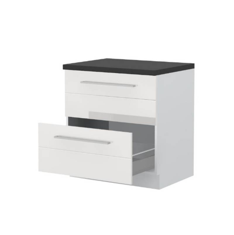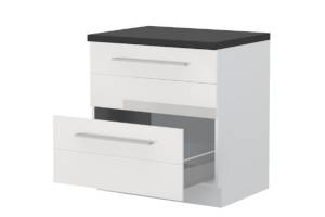 - Partea frontală a elementului este din MDF profilat, infoliat (nuante disponibile: alb lucios sau bej lucios) (18mm)