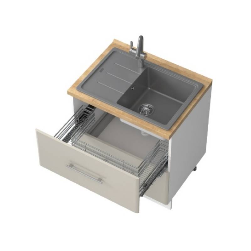 - Partea frontală a elementului este din MDF profilat, infoliat (nuante disponibile: alb lucios sau bej lucios) (18mm)