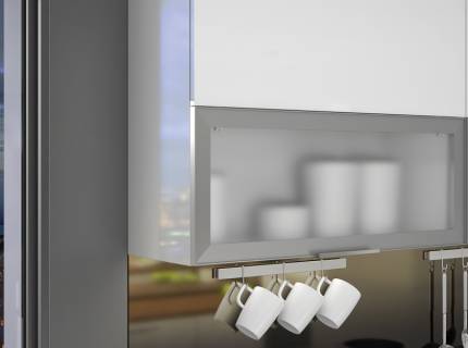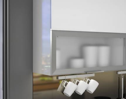 Alb lucios și detalii subtile de lemn brun. Obține o bucătărie ultramodernă și adaugă funcționalitate cu ajutorul colecției Riva.