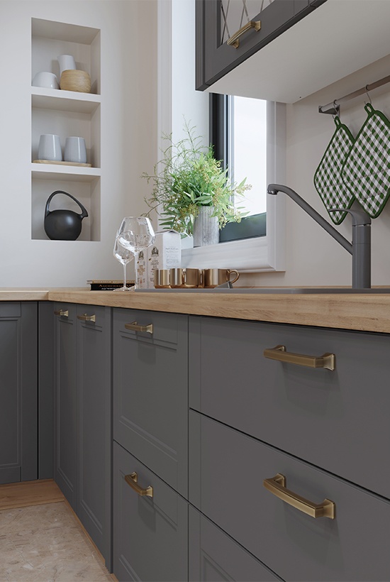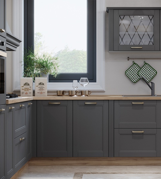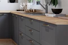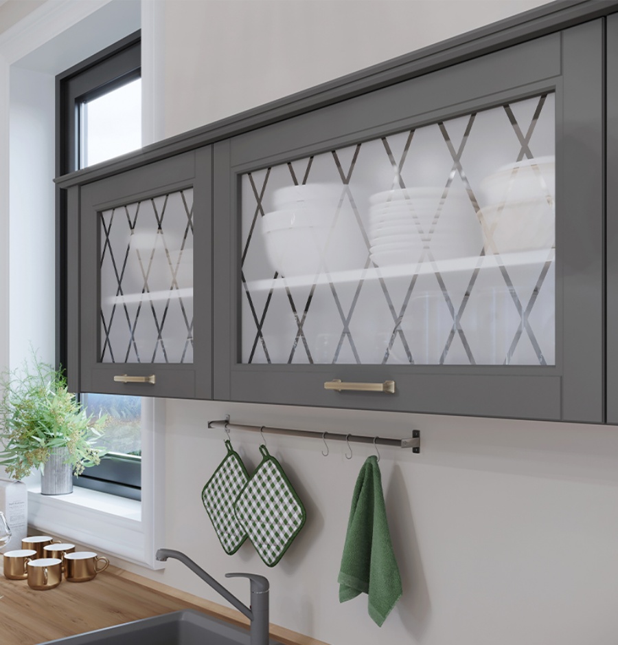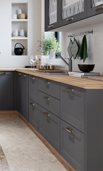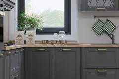 - Fronturile elementului sunt realizate din MDF sculptat complet lacuit cu lac UV de culoare grafit sau alb cu un efect mat moale.