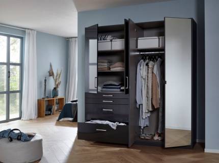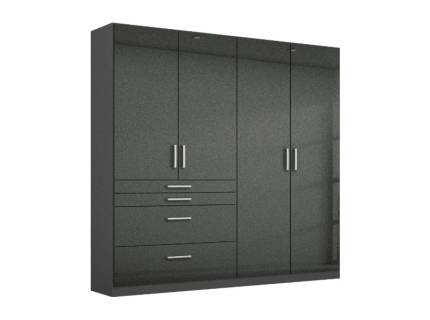 Dulap cu 4 usi cu balamale si 4 sertare HOMBURG 181x197x54cm gri metalic/ gri lucios - oglinda, manere crom