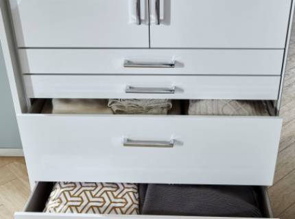Dulap cu 3 usi cu balamale si 4 sertare HOMBURG 136x197x54cm alb alpin/ alb lucios, manere crom