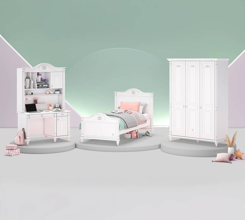 Colectia Romantic : creeaza un spatiu plin de caldura si rafinament. Mobilierul alb, cu linii clasice si detalii delicate, aduce un plus de eleganta si functionalitate camerei. Perfect pentru un decor de poveste, potrivit pentru odihna.