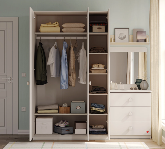 🛋️ Descoperă colecția Varia: design scandinav, spații inteligente de depozitare și mobilier ideal pentru un dormitor luminos.