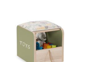 Taburetul are spatiu pentru depozitare, iar funia atasata ofera celor mici posibilitatea de a se juca.