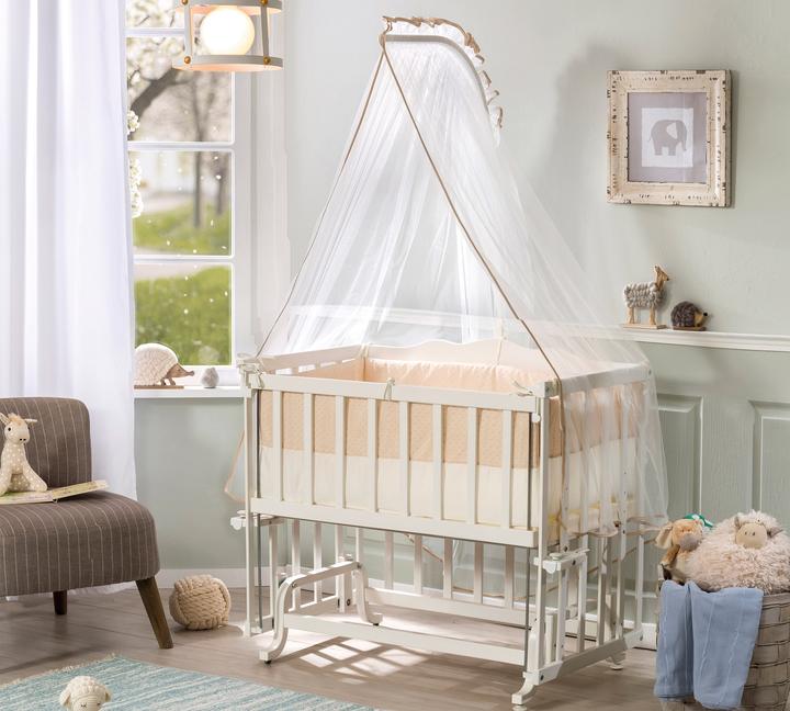 Produsul include, de asemenea, un set de protecție laterală, saltea, pernă decorativă și baldachin.