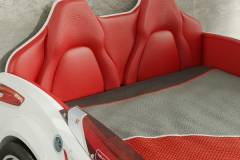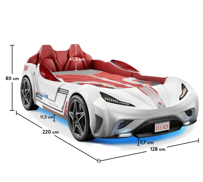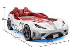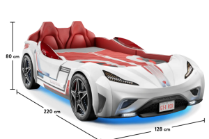 Patul contine tăblie în formă de scaun de maşină din piele ecologică.
