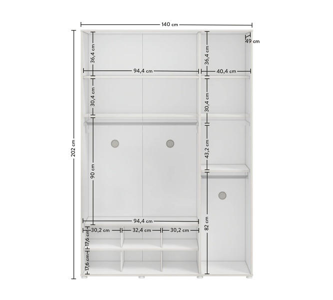 Dulapul este configurat in interior cu 7 polite, 4 separatoare si 2 bare de umeras.