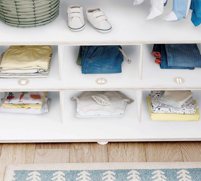 Rafturile și umerașele din garderobă sunt concepute în funcție de înălțimea copilului, de raporturile de vârstă si cu un sistem mobil aleatoriu în trei etape.