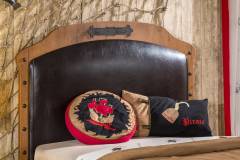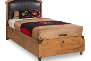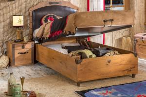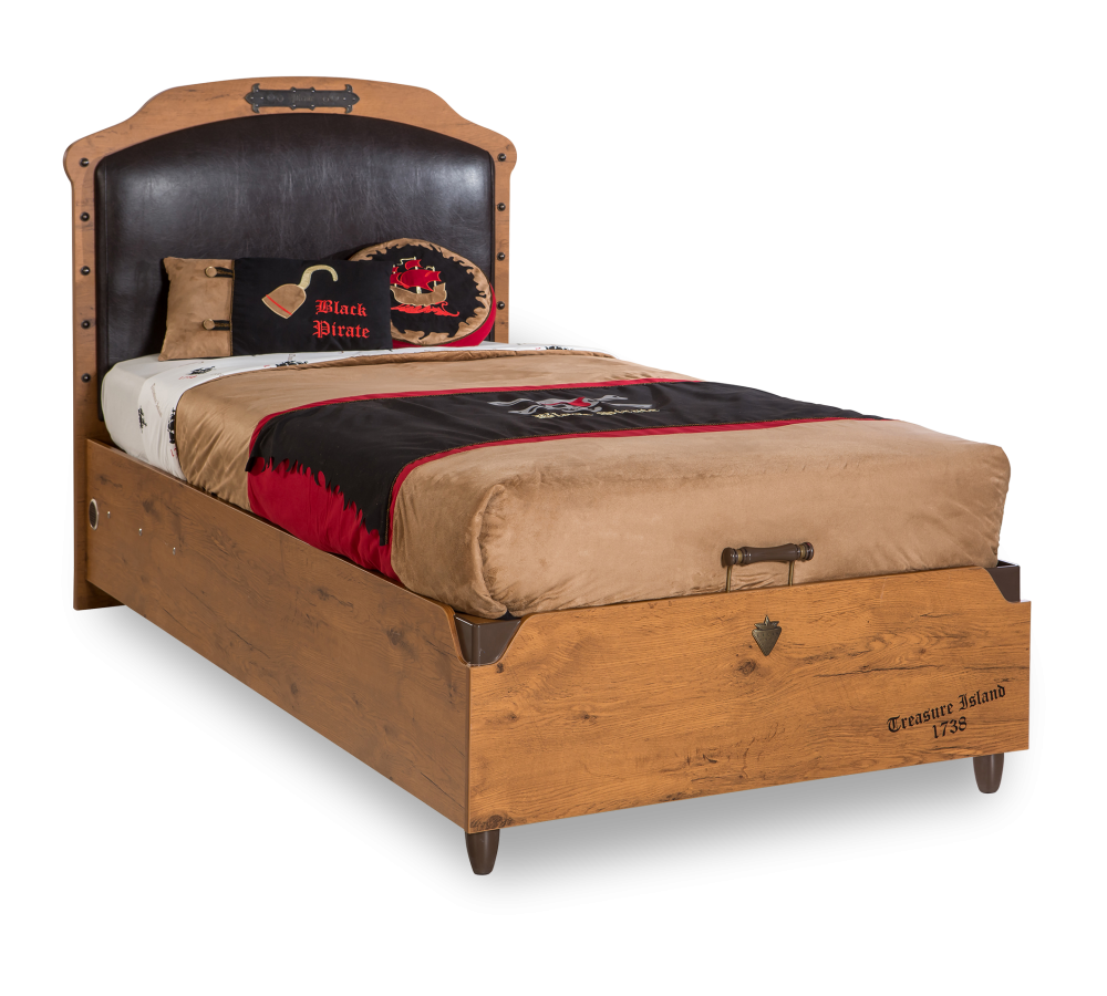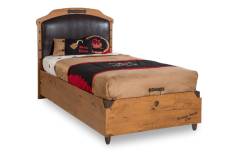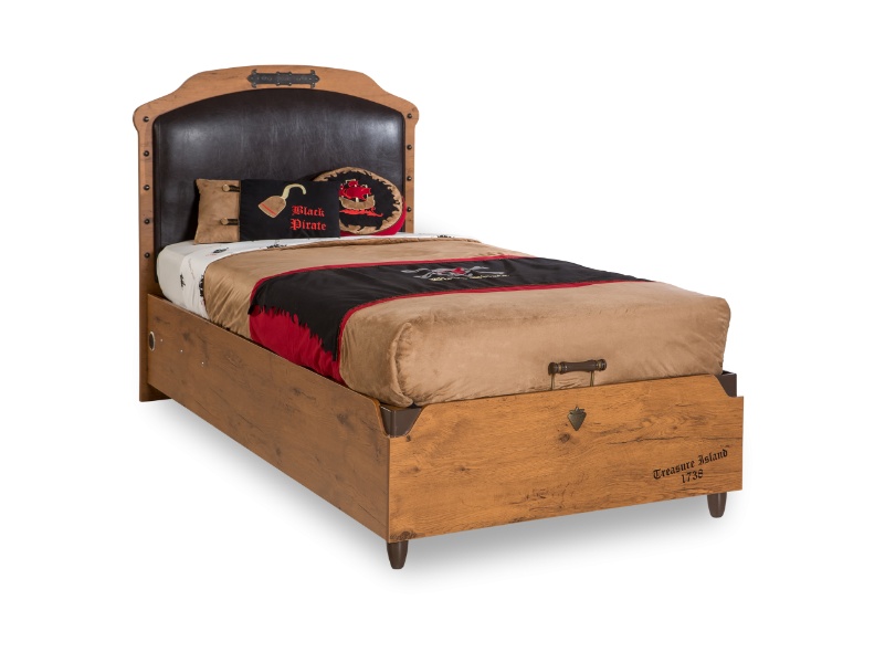 Patul din pal are lada pentru depozitare si tablie tapitata.