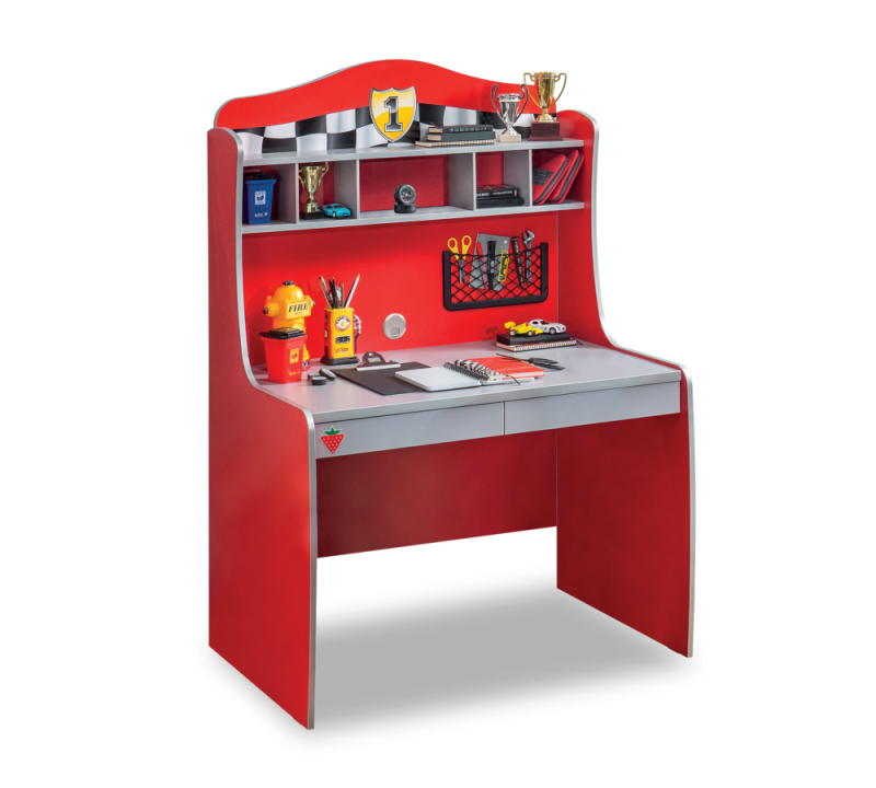 Colecția Racecup – un decor plin de energie și inspirație din lumea curselor auto. Include mobilier funcțional și vibrant, cum ar fi birouri, rafturi și accesorii, toate în culori dinamice de roșu și negru. Ideală pentru a crea o cameră tematică, perfectă pentru micii pasionați de viteză și aventură!