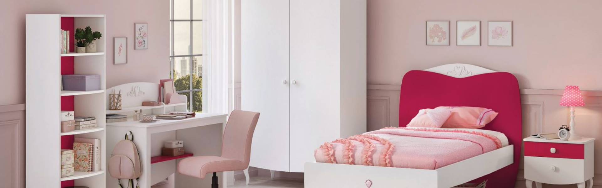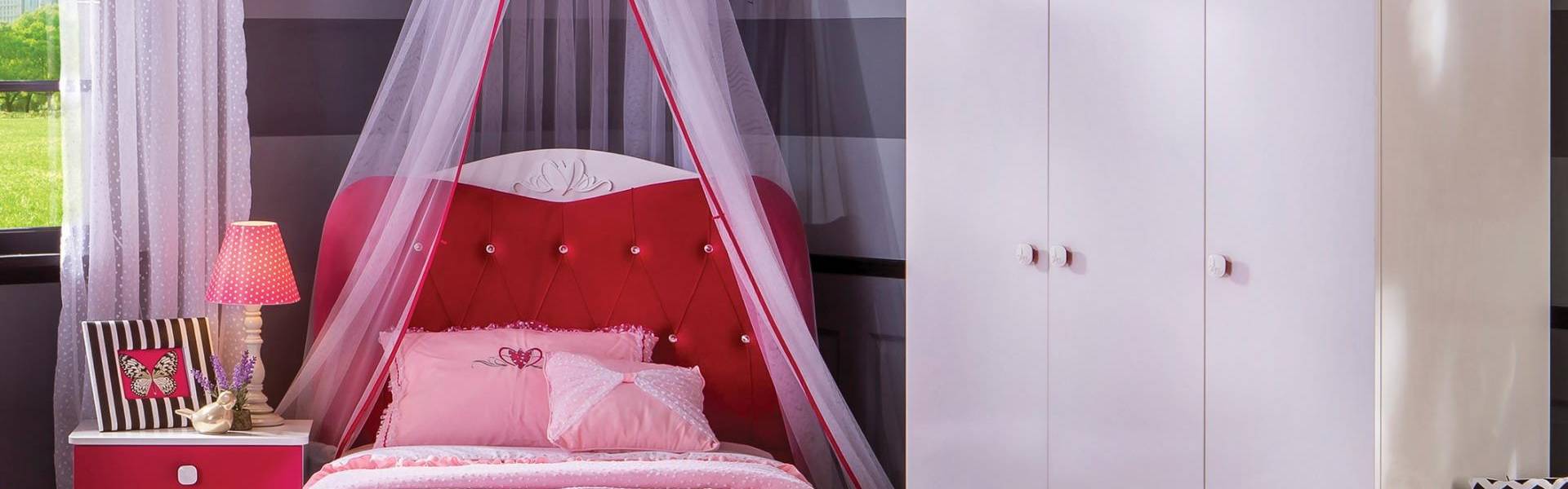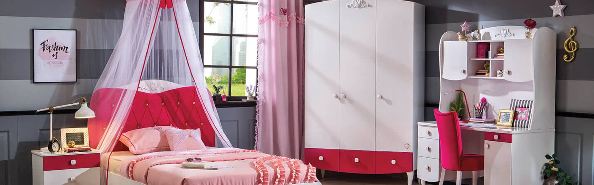 Nuanțe jucăușe de roz și alb, design practic. Oferă-i un dormitor plin de viață și de personalitate copilului tău, apoi privește cum îl va transforma într-un palat!