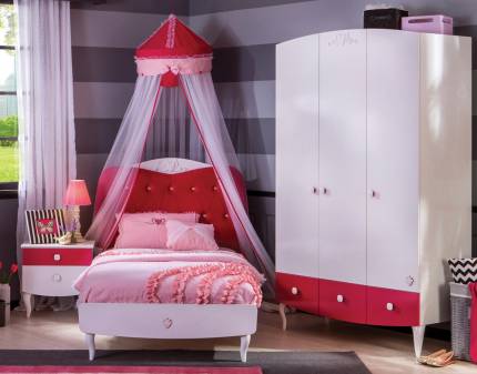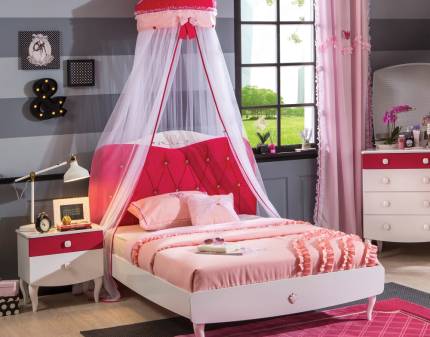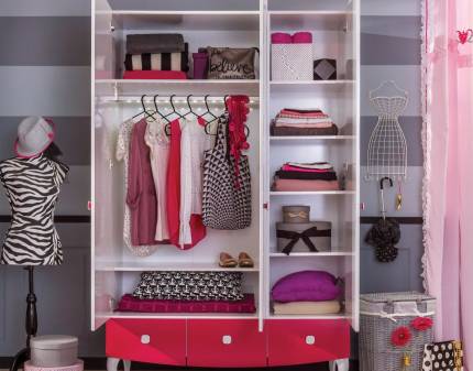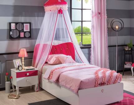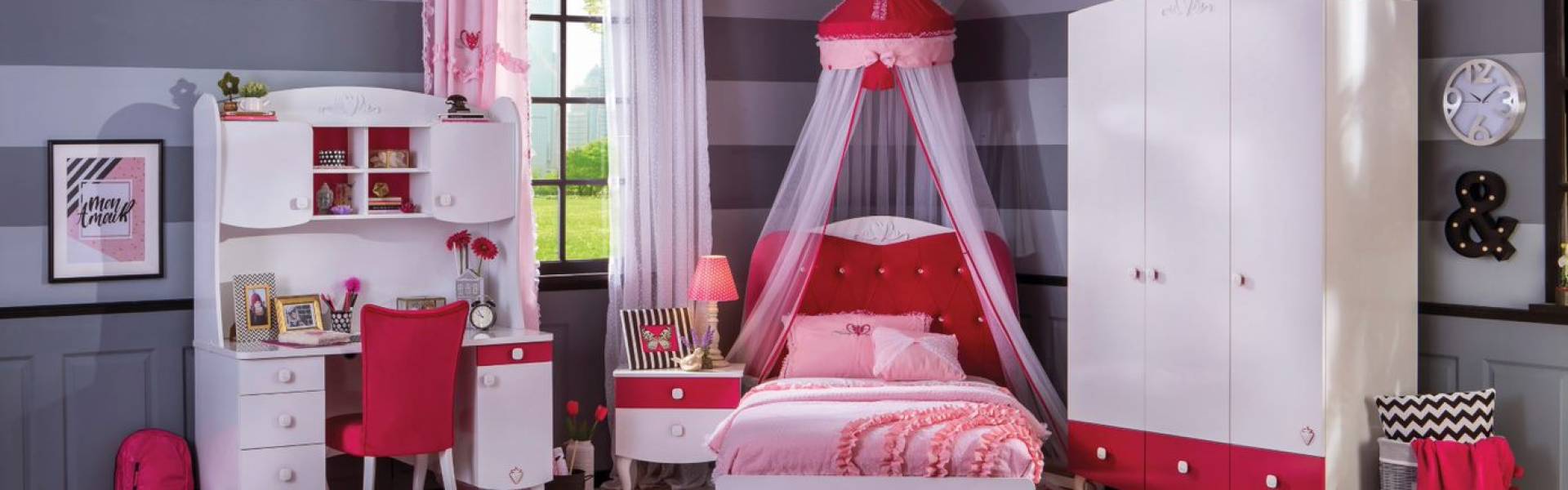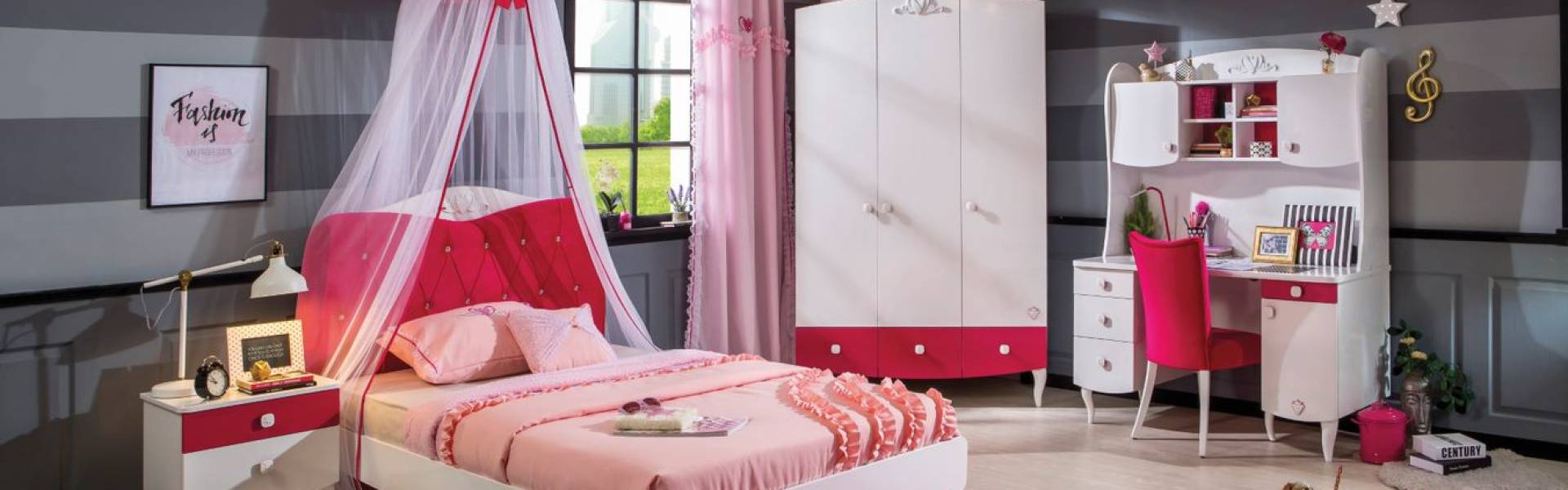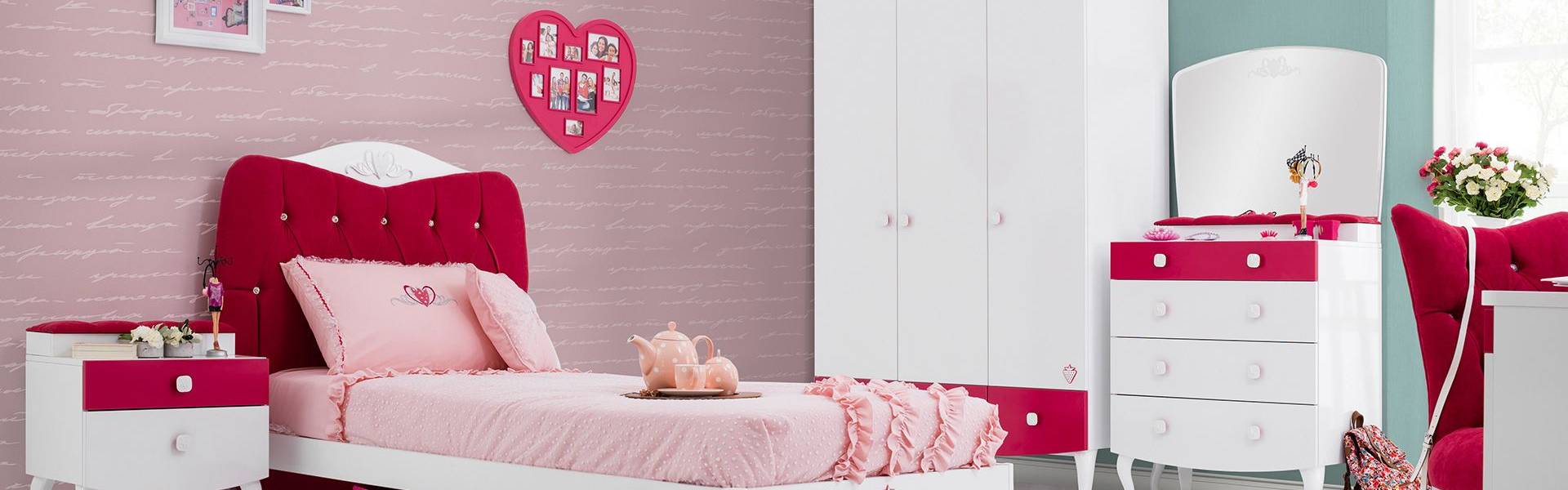 Nuanțe jucăușe de roz și alb, design practic. Oferă-i un dormitor plin de viață și de personalitate copilului tău, apoi privește cum îl va transforma într-un palat!