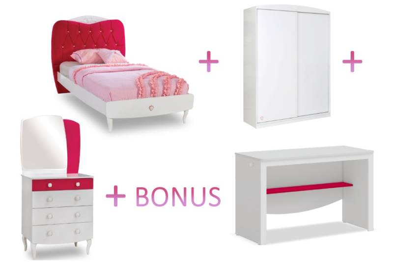 Pachet dulap cu usi glisante + pat (120x200cm) + comoda cu oglinda + BONUS birou Line YAKUT