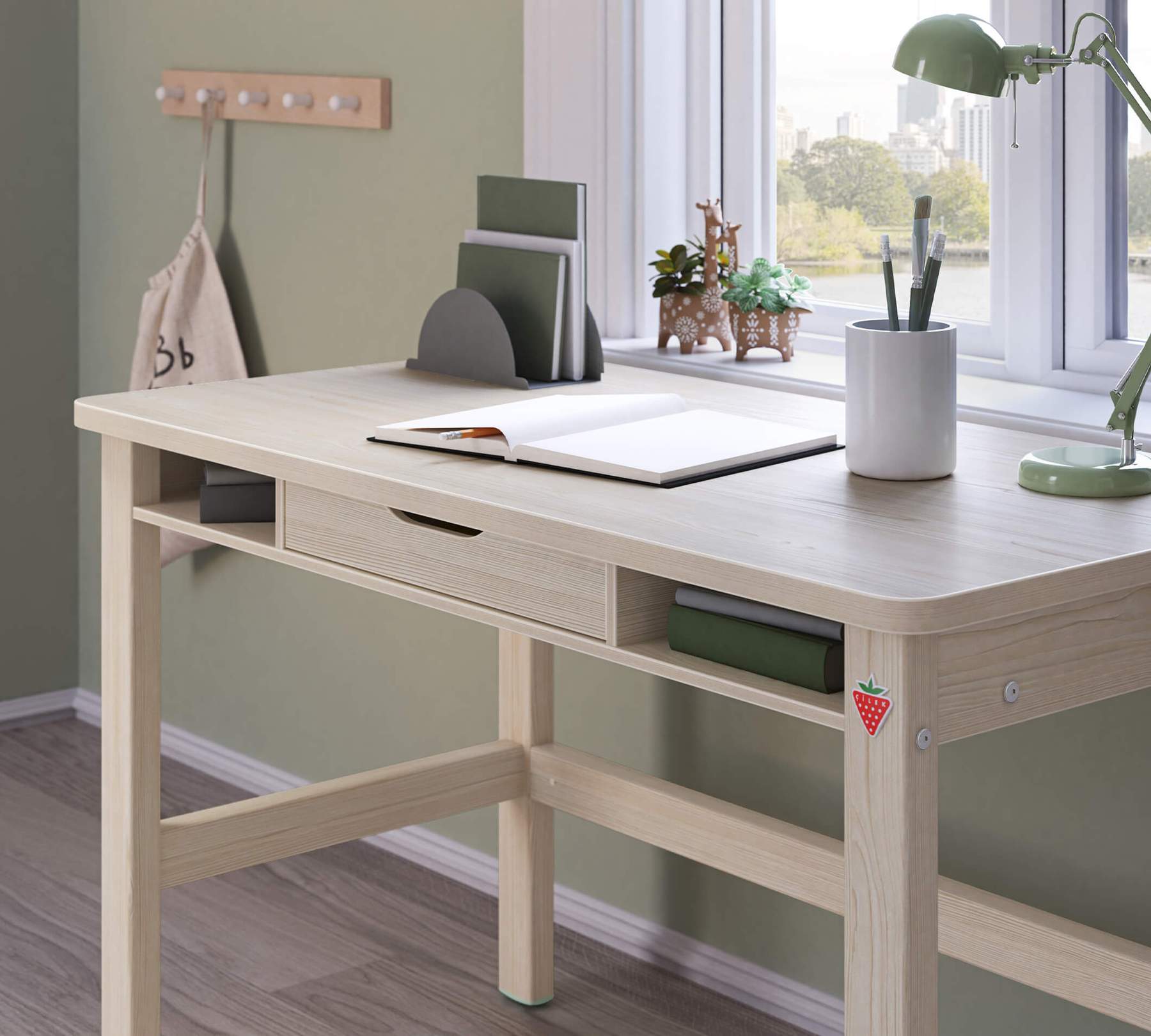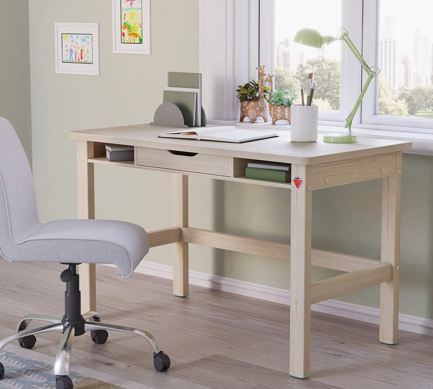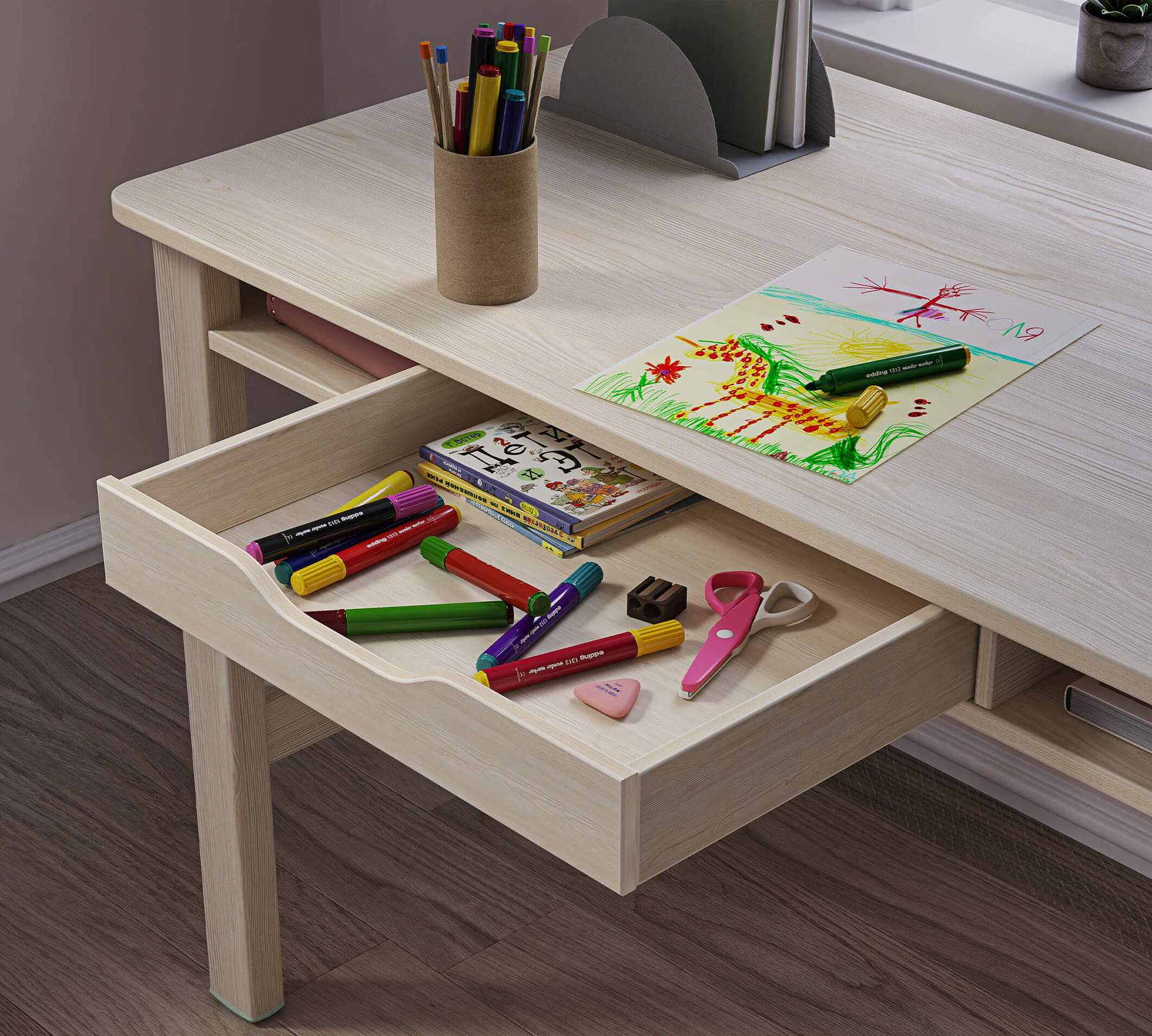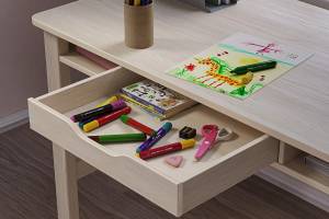 Biroul are un sertar cu role pentru o deschidere si inchidere usoara.