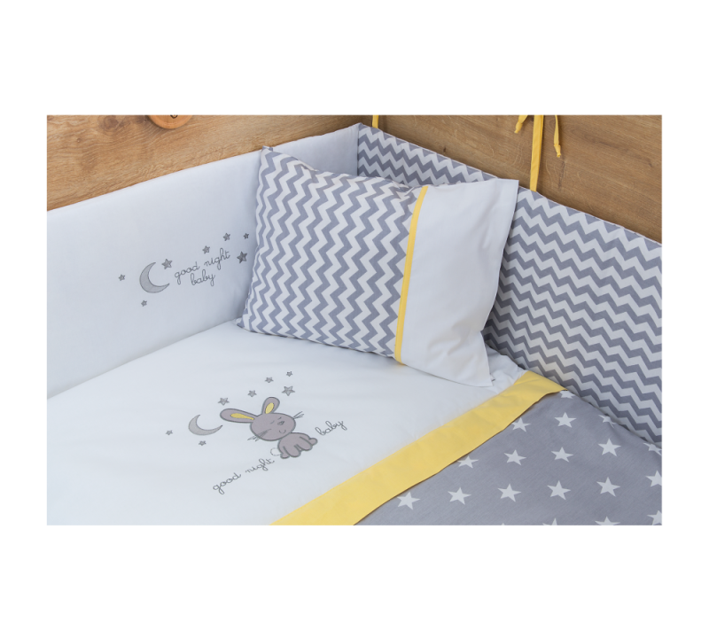 Set pătuț HAPPY NIGHT, realizat din material textil 100% bumbac cu umplutură 100% poliester. Moale, respirabil și confortabil, ideal pentru un somn liniștit al bebelușului. Alege siguranța și calitatea!
