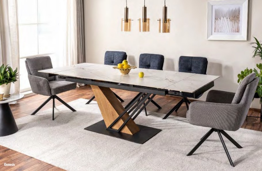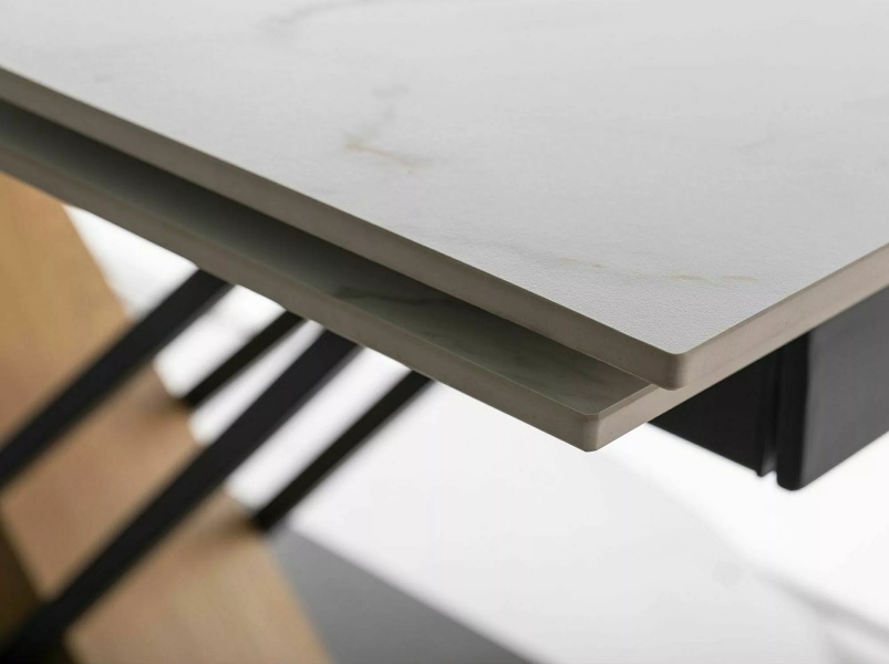 Masa extensibila GENESIS WHITE din ceramica cu efect de marmura alba, MDF cu furnir lemn si metal negru 180-240x90xH75cm