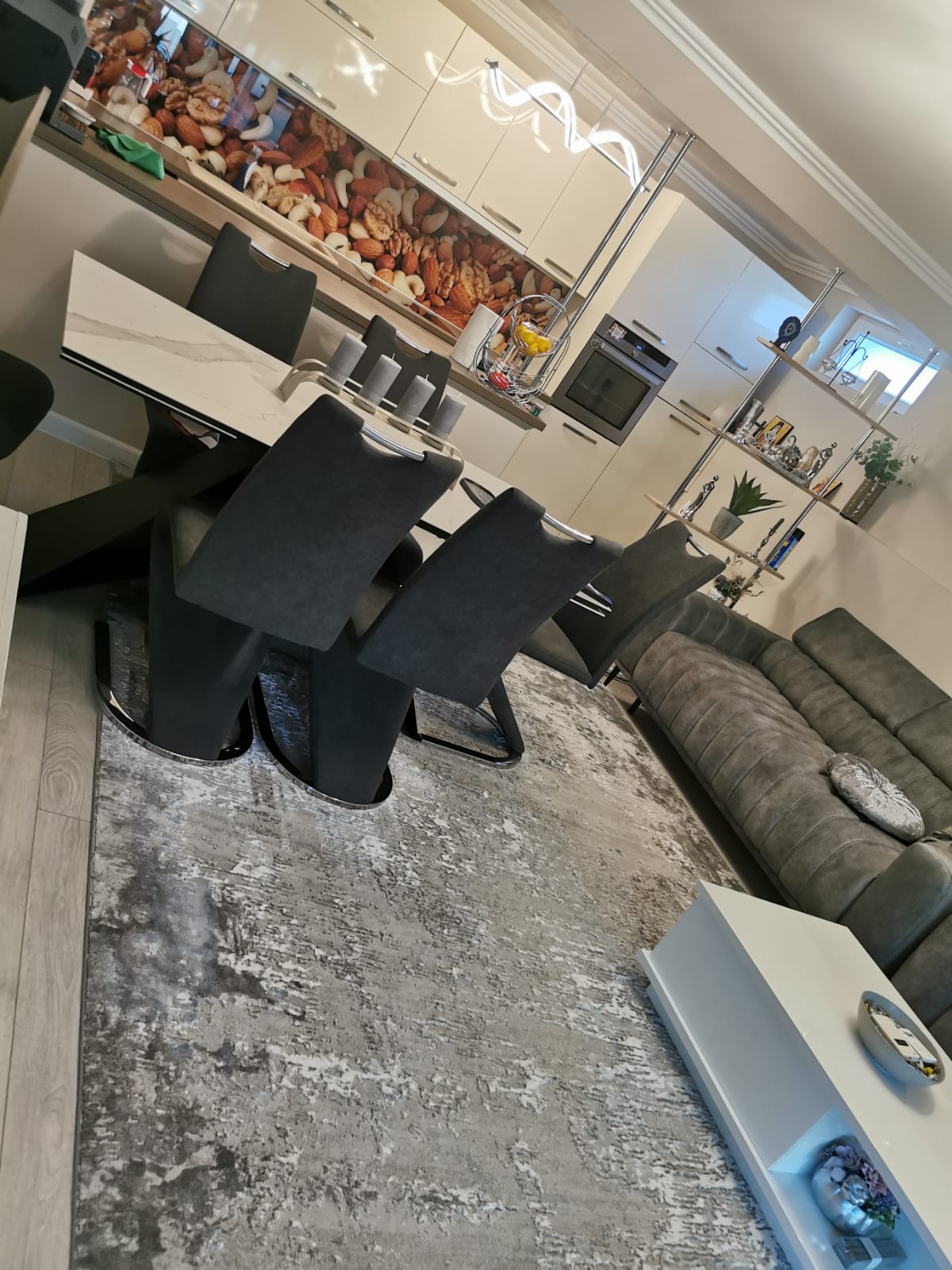 Blat: ceramica cu efect de marmura alba si sticla securizata termorezistenta