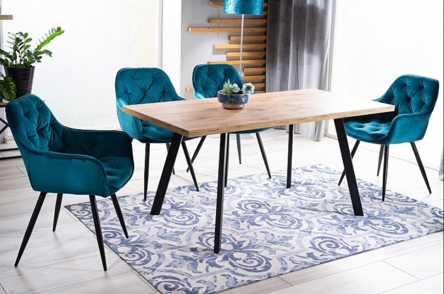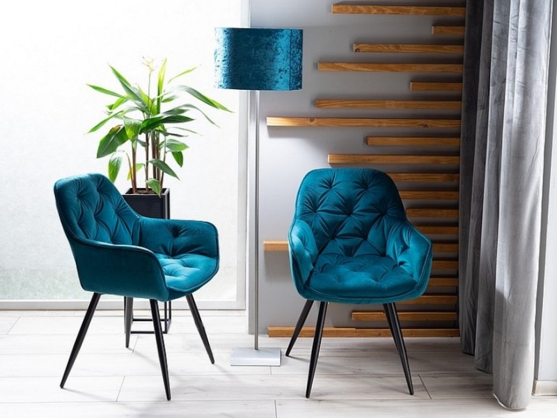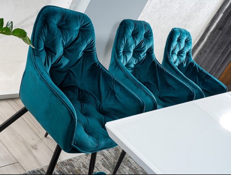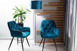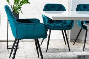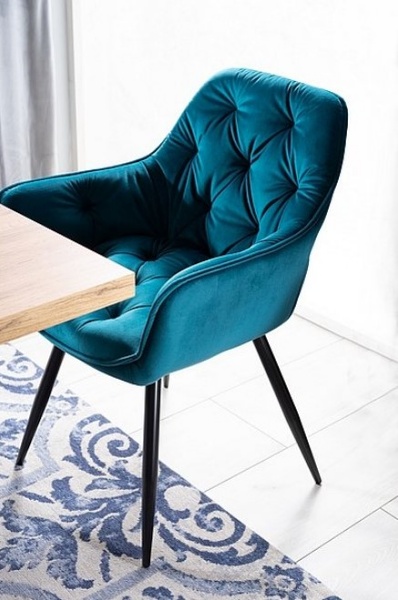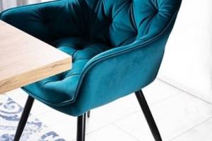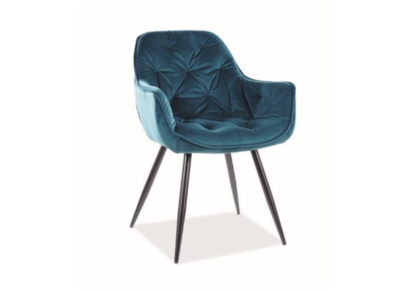 Scaun turcoise CHERRY VELVET, cu tapiterie din catifea Bluvel 85 (turcoise) si picioare metalice negre. Design elegant si vibrant, ideal pentru a aduce un plus de culoare si rafinament oricarui spatiu!