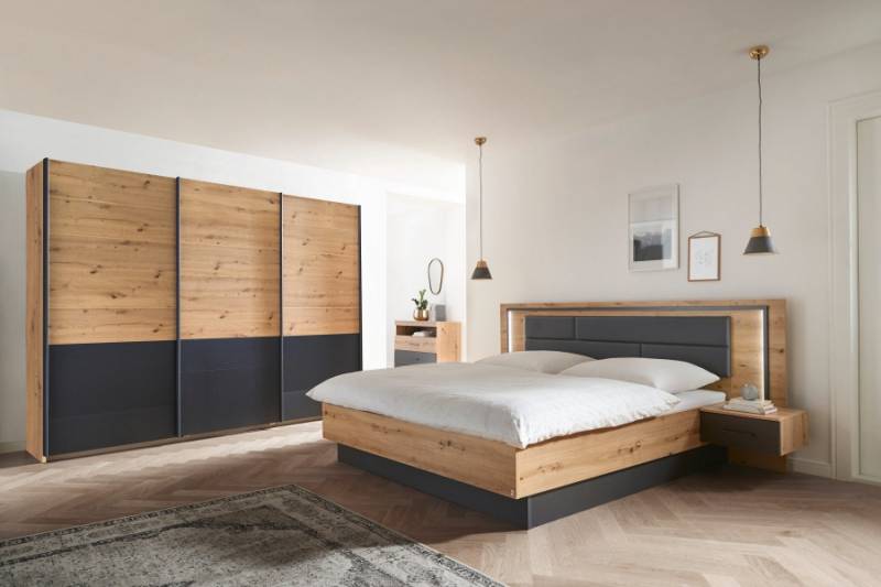 O portiune din tablia patului este tapitata cu ecopiele nuanta Basalt.