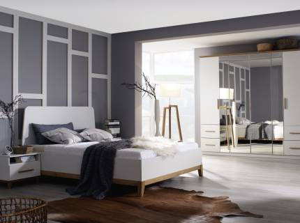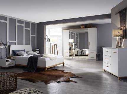 Dulap cu 6 usi cu balamale si 4 sertare CARLSSON 226x212x58cm alb alpin/ oglinda, manere stejar