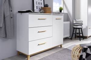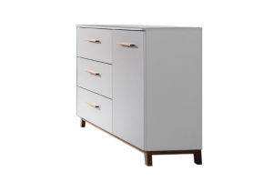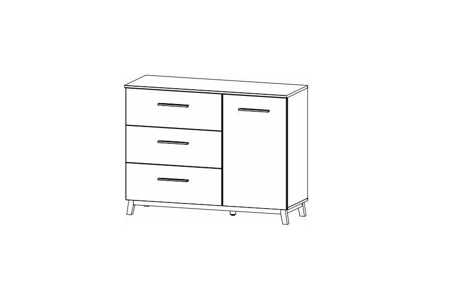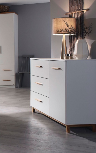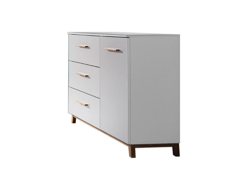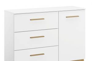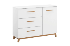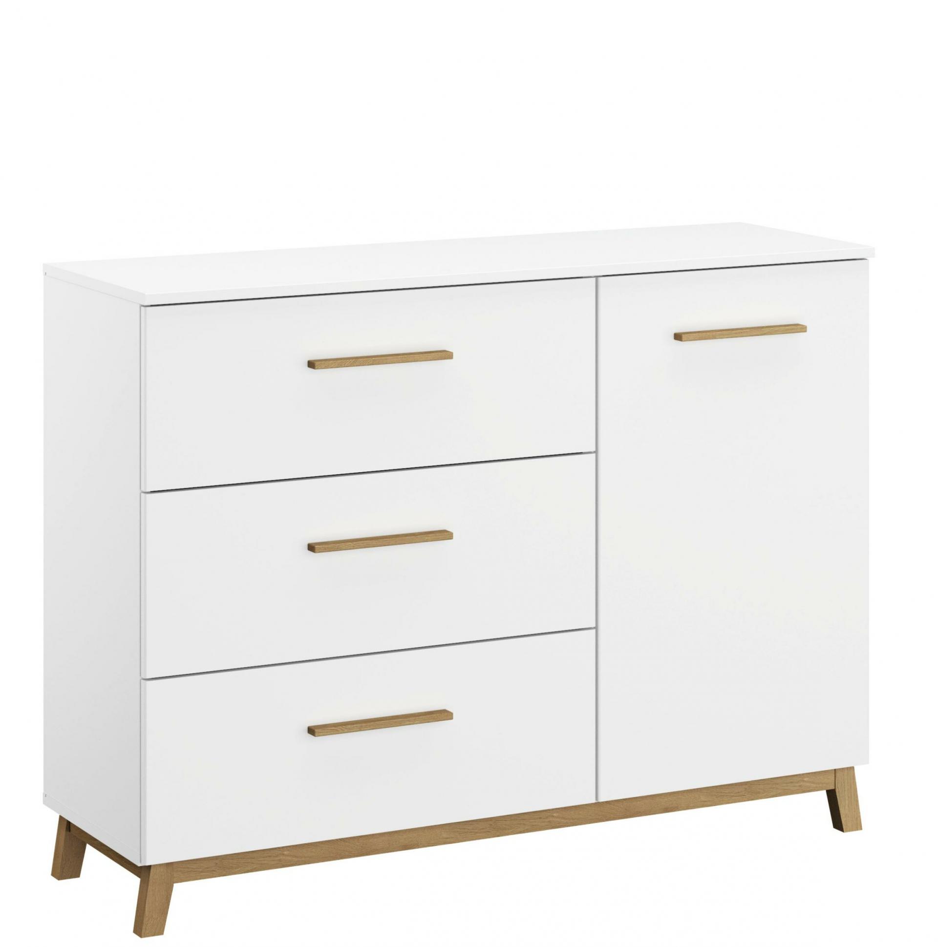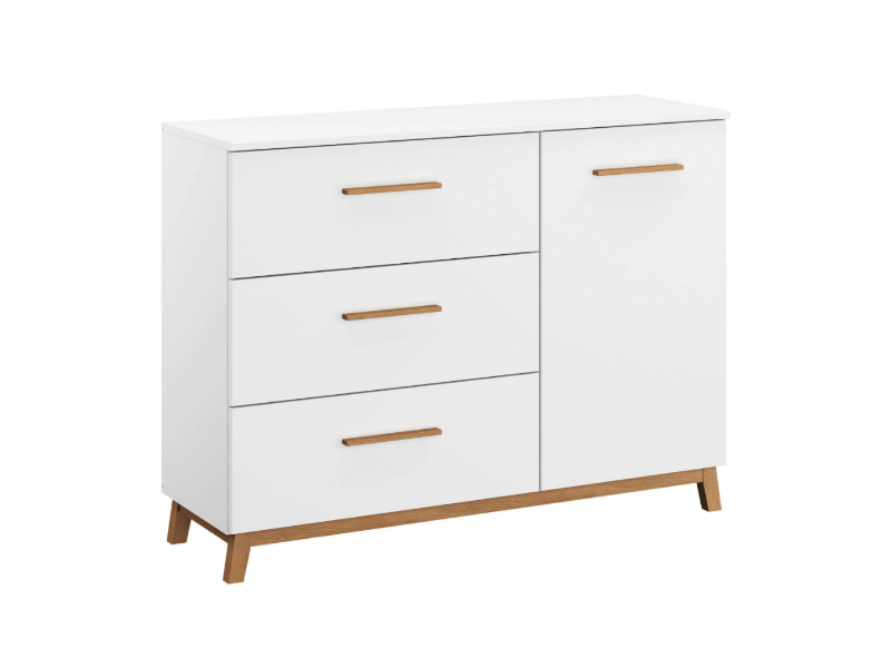 Comoda cu 1 usa si 3 sertare CARLSSON 116x89x42cm alb alpin, manere si picioare stejar