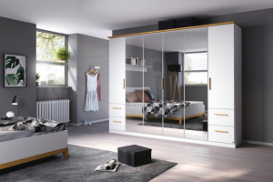 Dulap cu 6 usi cu balamale si 4 sertare CARLSSON 271x212x58cm alb alpin/ oglinda, manere stejar