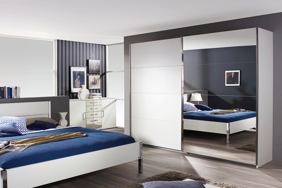 Dulap cu usi glisante MOITA 181x210x62cm alb alpin/ oglinda, maner crom