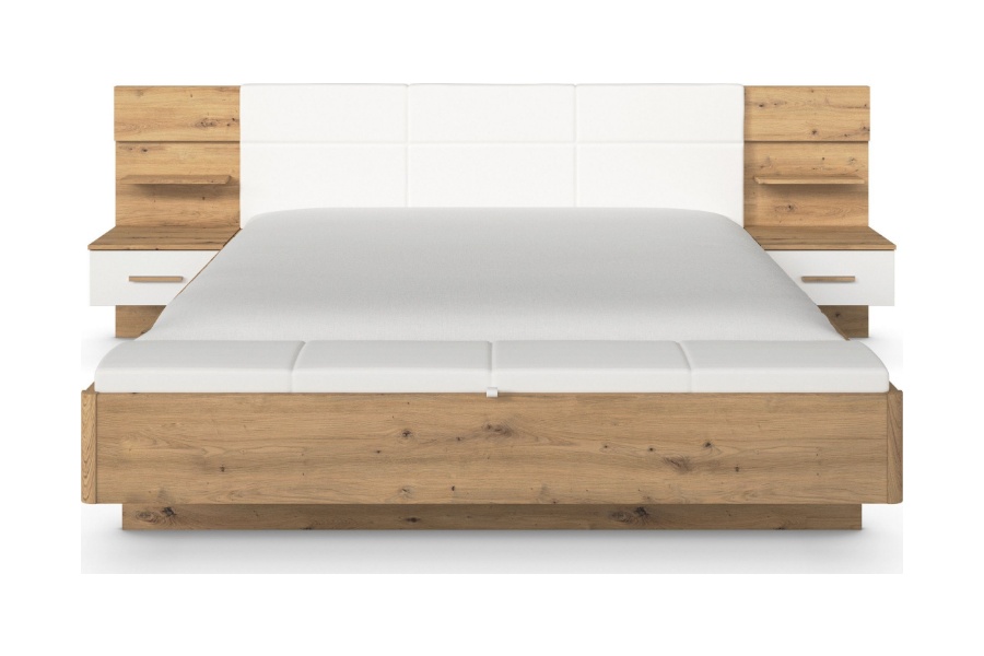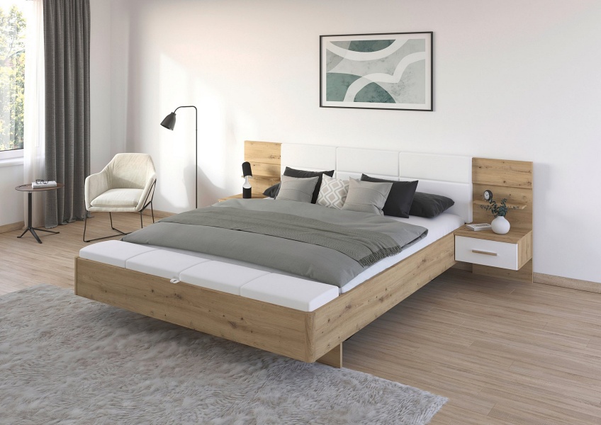 Patul are integrat la picioare o banca care are un spatiu pentru depozitare tapitata cu ecopiele alba. Banca are sistem de ridicare pe gaz.