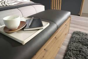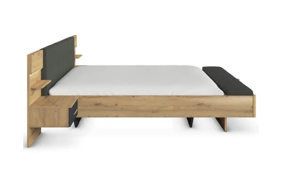 Patul are integrat la picioare o banca care are un spatiu pentru depozitare tapitata cu ecopiele alba. Banca are sistem de ridicare pe gaz.