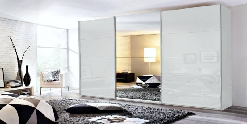 Dulap cu usi glisante KULMBACH 361x210x62cm alb alpin/ sticla alba-oglinda configurabil