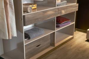 Dulapul este compartimentat exact ca in poza de prezentare. Raftul din stanga nu este inclus.