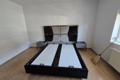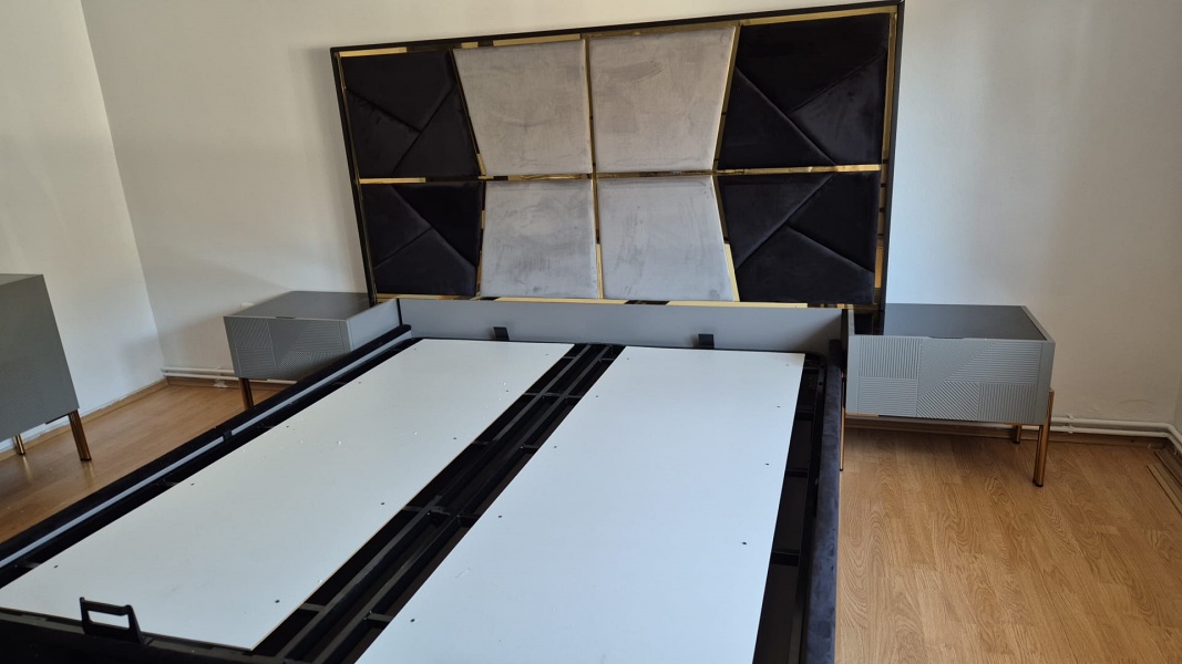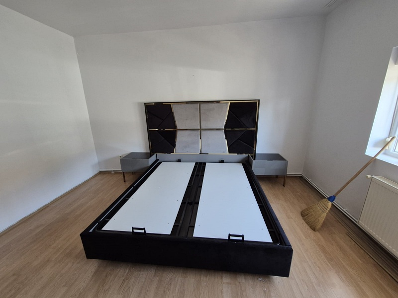 Patul este prevazut cu spatiu pentru depozitare tip lada si cu somiera (sistem de rabatare cu pistoane pe gaz)